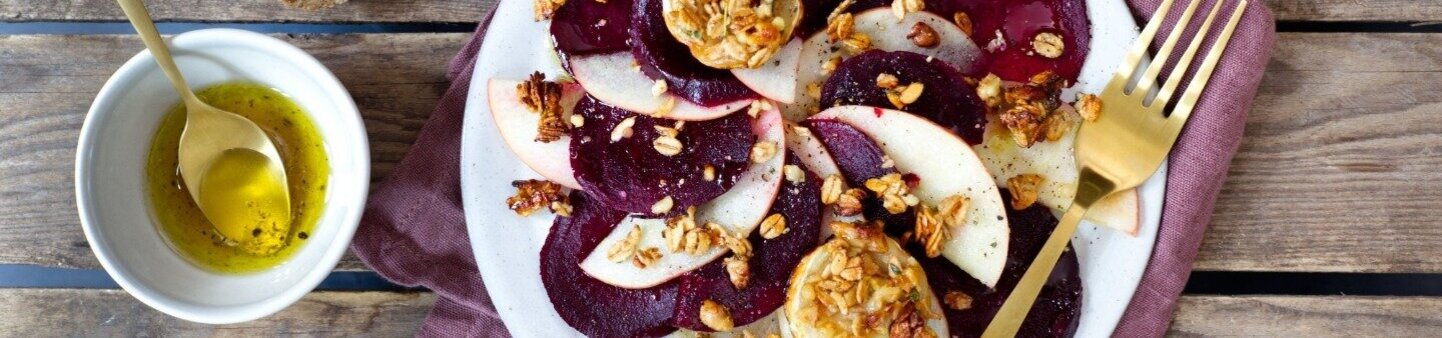 Quelle: https://eatsmarter.de/rezepte/apfel-bete-carpaccio-mit-ziegenkaese-und-honig-dinkel-crunch-1