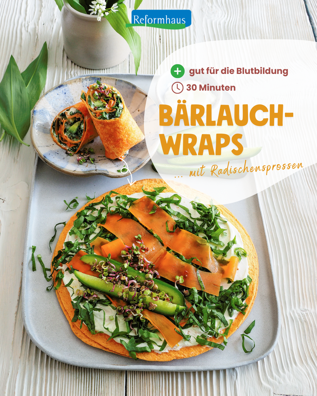 Schnell gewickelt und in den Picknickkorb gepackt: Diese Bärlauch-Wraps mit Möhrenlachs und Radieschensprossen machen Lust auf Frühling. Bärlauch wirkt sich positiv auf unsere Blutbildung aus und unterstützt sogar bei der Ausscheidung von Giftstoffen, Schwermetallen und zellschädigenden Substanzen. Also, ran ans Wickeln!