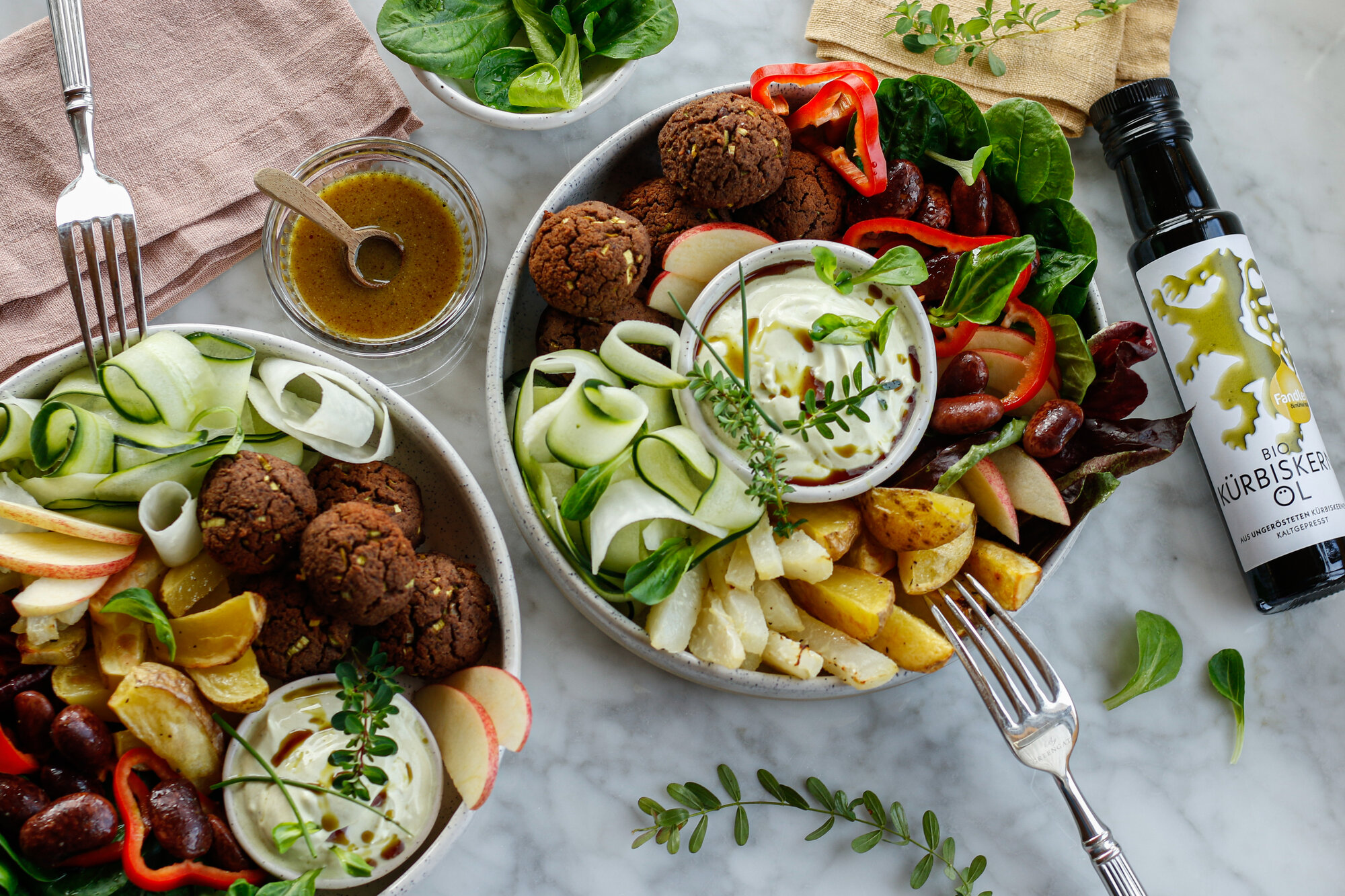Für den Dip alle Zutaten verrühren und abschmecken. Die gebackenen Falafel mit den Kohlrabi + Kartoffelsticks, den Gurken, Apfelspalten, Paprika und dem Vogerlsalat hübsch auf vier Teller anrichten. Gemüse und Salat mit dem Dressing beträufeln. Den Kürbiskernöl-Dip in einem Schälchen dazu servieren.