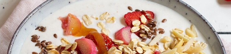 Mit Erdbeeren und Rhabarber wird diese cremige Hafer-Bowl zum fruchtigen Frühstücks-Highlight: Mandeln und Leinsamen versorgen uns mit ungesättigten Fettsäuren und reichlich Protein. Manuka Honig verwöhnt mit mild-aromatischem Geschmack und einem Plus an wertvollen Inhaltsstoffen.
