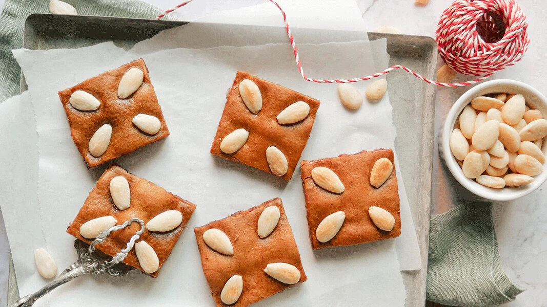 - Dann zu zwei gleich großen Rechtecken ausrollen. Eine Teigplatte auf ein mit Backpapier ausgelegtes Backblech legen. Preiselbeermarmelade auf die Teighälfte streichen. Gehobelte Mandeln und Weinbeeren darauf verteilen, dann mit der anderen Teighälfte abdecken und mit dem Messer ca. 25-30 Stücke durch leichtes Einritzen markieren. Agavendicksaft mit Wasser verrühren und den Teig damit bestreichen. Blanchierte Mandeln dekorativ auf dem Teig verteilen und leicht andrücken.