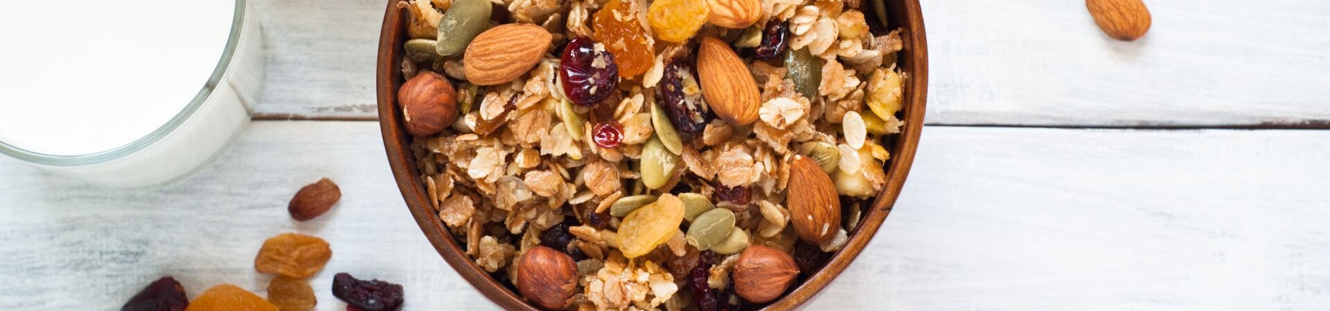 Backofen auf 140 °C Umluft vorheizen. Nusskerne grob hacken. Margarine bei geringer Temperatur im Topf schmelzen. Haferflocken, Braunhirsemehl, Nusskerne, Ölsaaten, Vanille und Zimt in einer großen Schüssel mischen. Agavendicksaft und flüssige Margarine zugeben und vermengen.