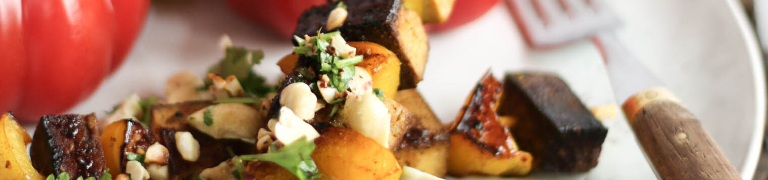 - Cashewkerne kurz in einer Pfanne ohne Fett leicht anrösten und abkühlen lassen. Spieße in etwas Kokosöl goldbraun braten und zum Schluss mit der übrigen Marinade glasieren. Cashewkerne und Koriander grob hacken, direkt vor dem Servieren vermengen und mit etwas Limettensaft und Salz abschmecken. Cashew Gremolata auf den Tofuspießen verteilen und zusammen mit den Tomaten servieren.