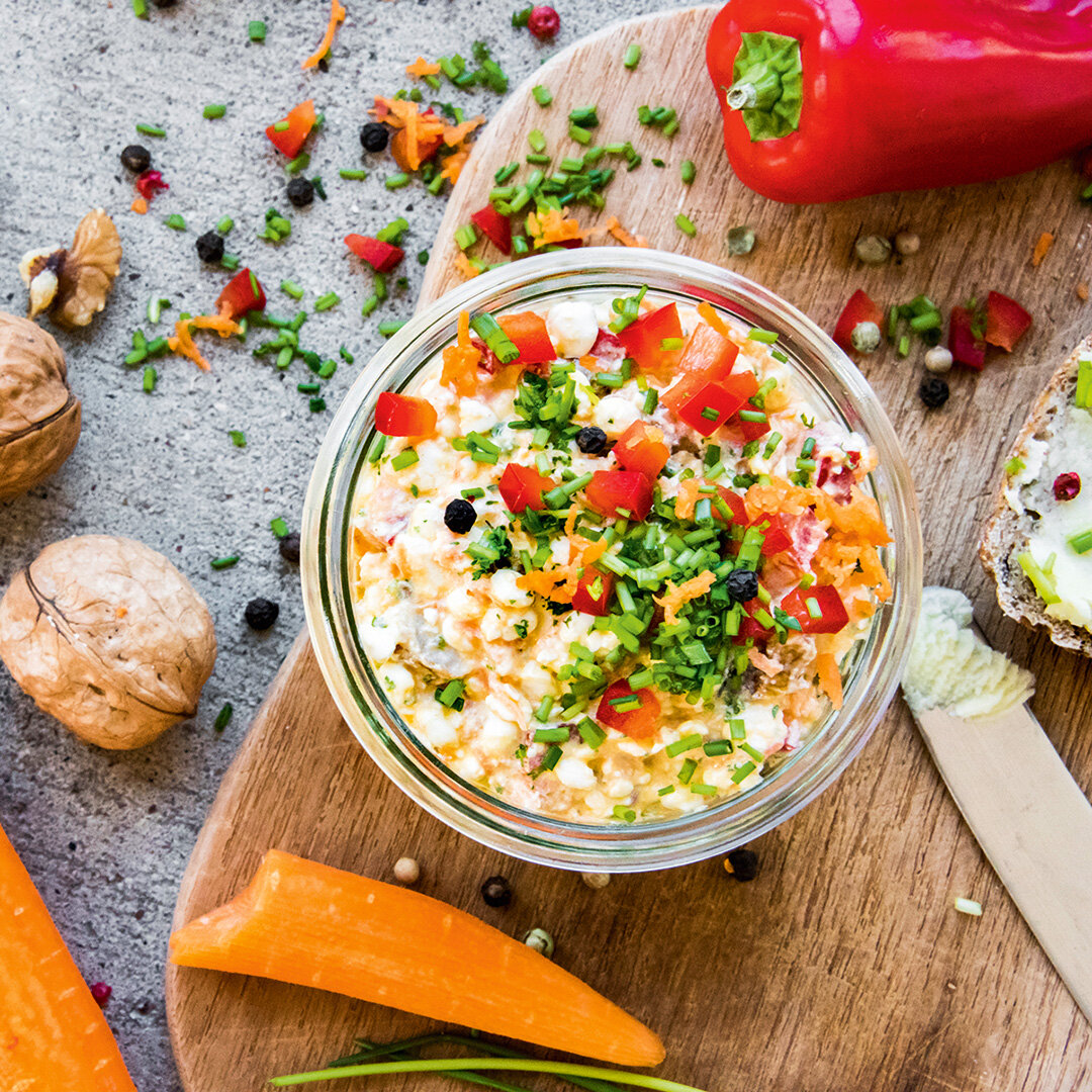 - Körnigen Frischkäse, Dr. Budwig Omega-3 Leinöl und die weiteren Zutaten miteinander vermischen und mit Salz, Pfeffer, Paprika und Muskat abschmecken.
