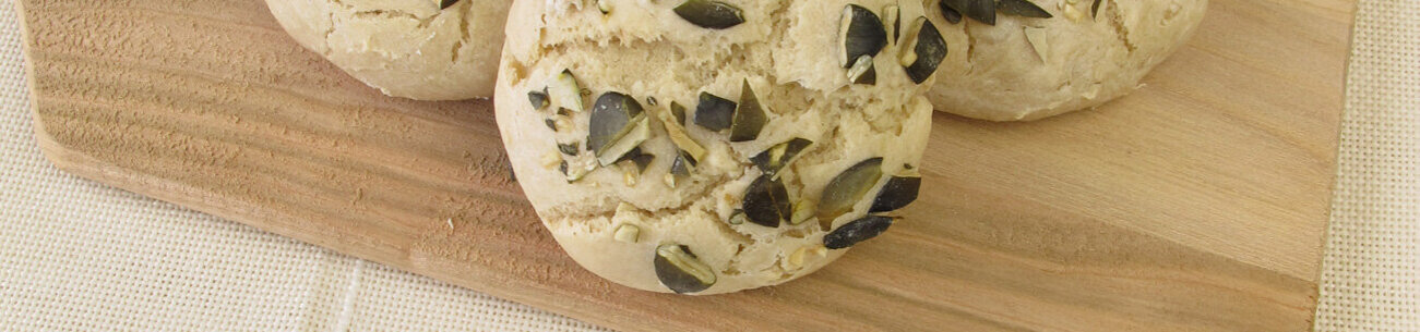 8 Portionen zu Kugeln formen, auf ein Backblech legen und die Oberfläche kreuzweise einschneiden. Mit Wasser bepinseln, dann mit 2–3 EL gehackten Kürbiskernen und etwas Mehl bestreuen und ca. 15 Min. gehen lassen. Backofen auf 220 °C (Umluft 200 °C) vorheizen, ein feuerfestes Schälchen mit kochendem Wasser mit in den Backofen stellen. Sobald sich Schwaden bilden, auf mittlerer Schiene ca. 20 Min. backen.