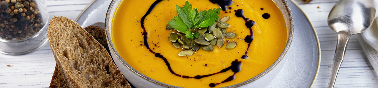- Brühe dazugießen und Kürbis weichkochen. Anschließend mit einem Pürierstab pürieren, mit Salz und Pfeffer abschmecken und Hafercuisine dazugeben.