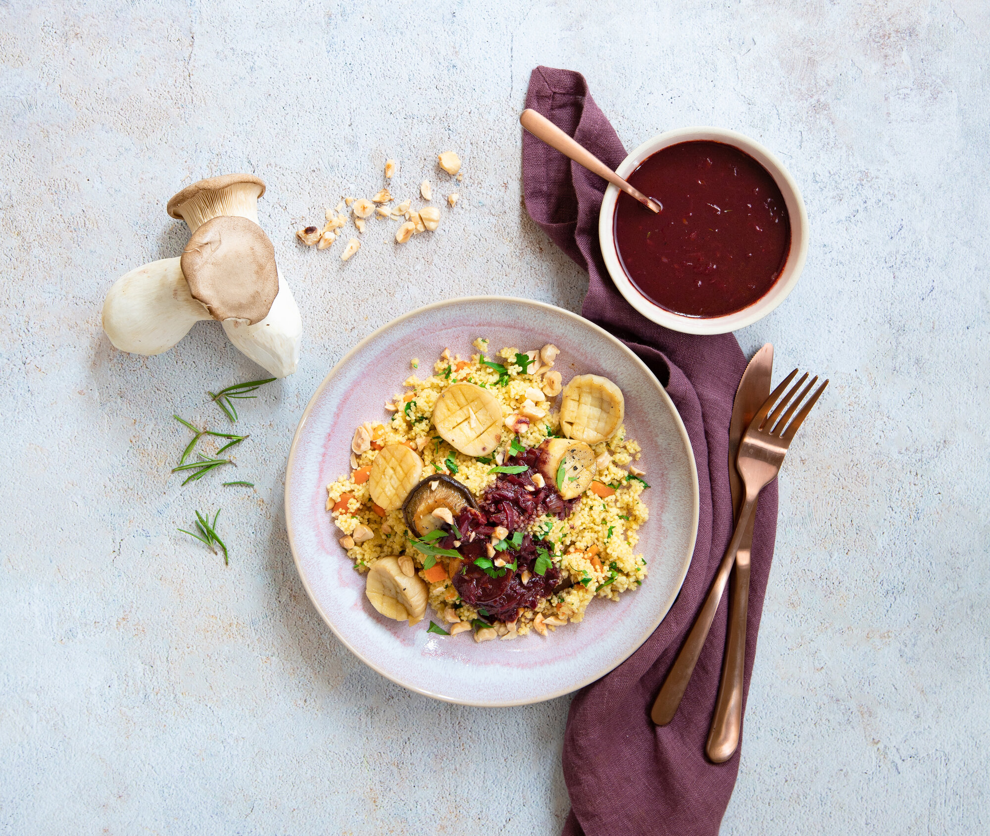 Goldhirse und Pilze spielen in diesem nährstoffreichen, leicht bekömmlichen Gericht die Hauptrolle: Egal, ob Kräuterseitlinge oder Champignons – probieren Sie das Pilz-Kräuter-Hirsotto am besten mit süß-säuerlich-herber Aroniasauce. Der intensive Geschmack macht definitiv Lust auf mehr.