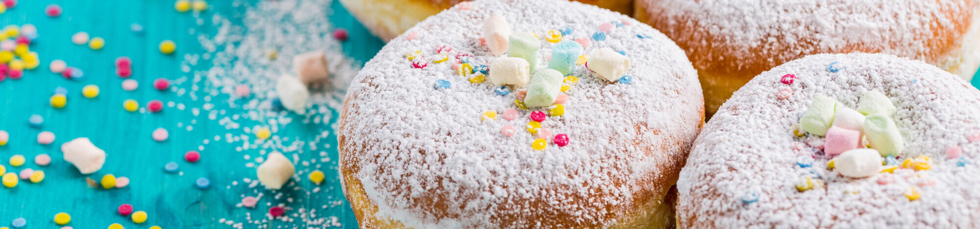 - Für die Glasur etwas Puderzucker mit wenig Wasser dicklich verrühren und die Hälfte der Krapfen damit verzieren, die andere Hälfte mit Puderzucker bestäuben. Nach Belieben den Zuckerguss mit geschmolzener dunkler Schokolade und Zuckerperlen